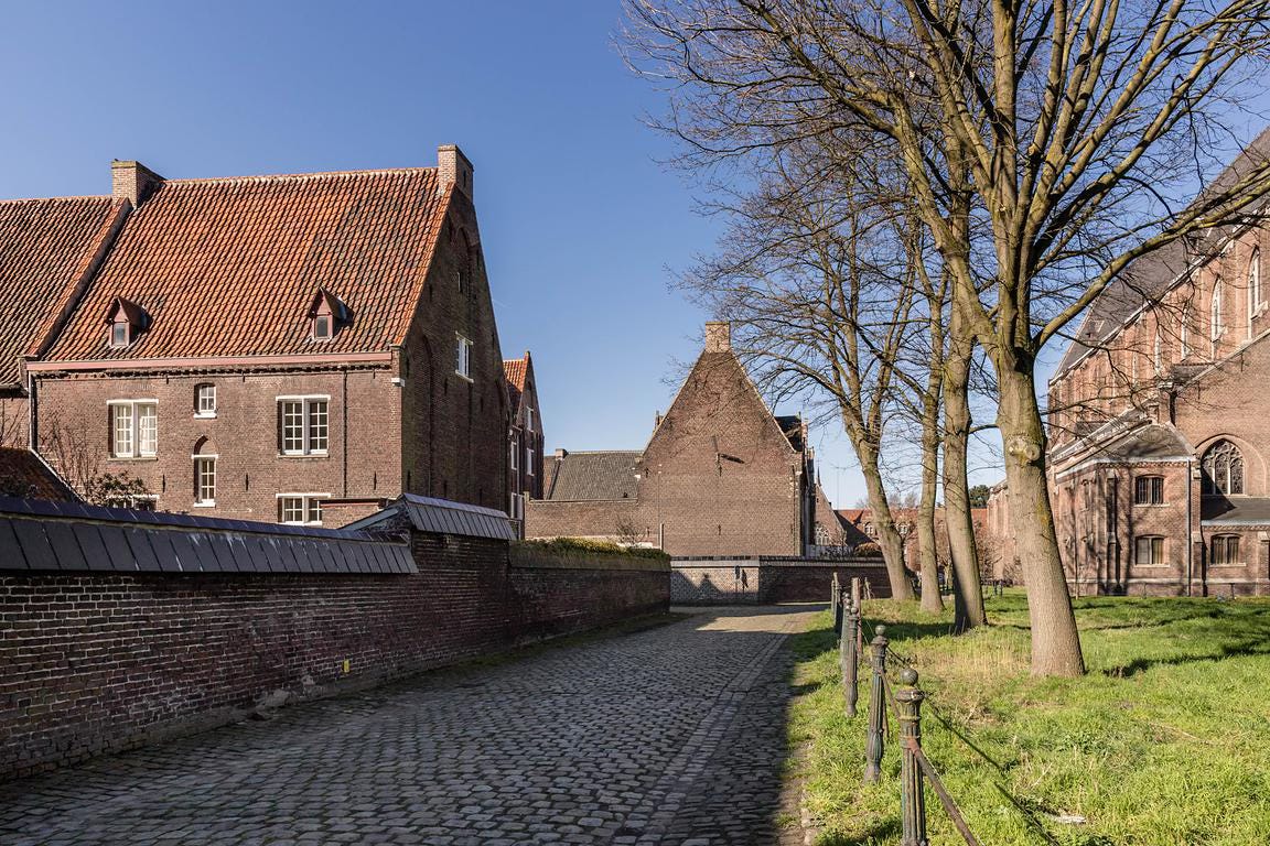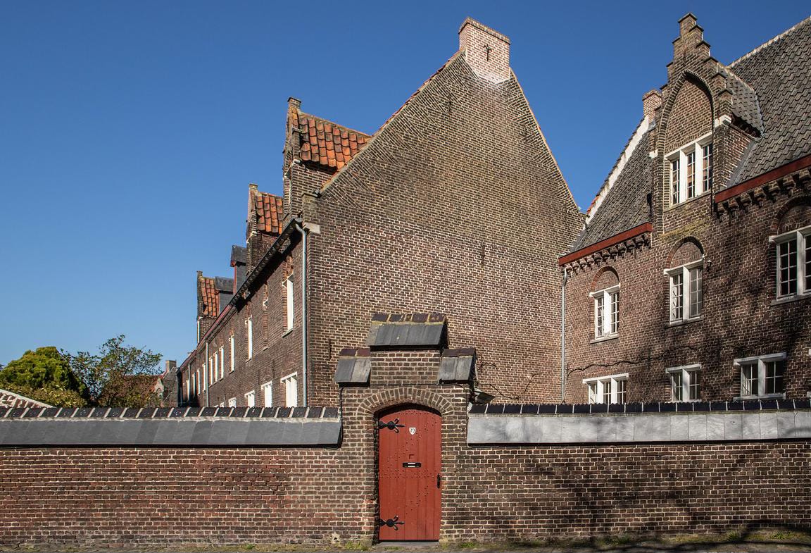 Ik sta op en wandel verder langs nauwe steegjes. Het hele terrein is gehuld in een monochromatisch roodbruin, kleur van de baksteen waarmee het destijds werd opgetrokken. Mooi is het niet, het Groot Begijnhof. Wie zoekt naar romantische esthetiek moet in Gent in de Lange Violettestraat zijn, in (jawel) het Klein Begijnhof. Keurig rood geschilderde huisjes, witgekalkte muren. Idyllisch plekje, plat gefotografeerd door drommen toeristen. Maar het laat me koud.