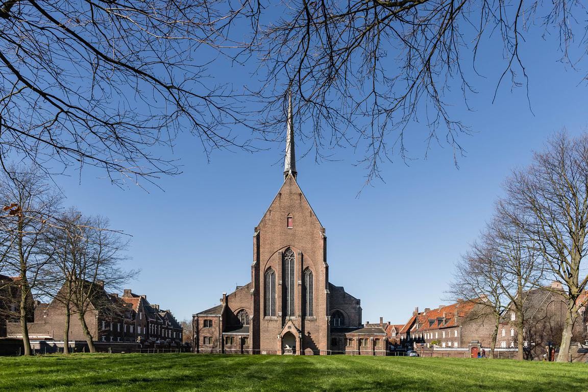 Ergens op een eerste verdieping gaat een raam open. Een vrouw van middelbare leeftijd. De grijze haren kort geknipt. Ze zwaait vrolijk terwijl ze de gordijnen verder open trekt. “Rustig hier, hé!”, roept ze. Haar stem weerkaatst oneerbiedig tegen de gevel van de H. Elisabeth van Thüringen, et al. Ik knik alleen maar en wuif terug, te beschroomd om de stilte nog meer te verstoren.